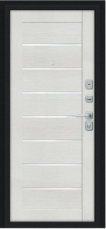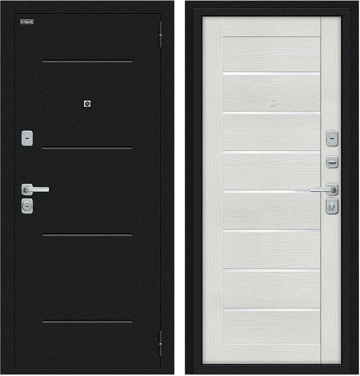 Надежная входная Дверь Браво Техно/BChrome Букле черное/Bianco Melinga премиум класса по цене 34 639 руб. Большая толщина стали защитит от проникновения в ваш дом, квартиру или коттедж. Используется очень качественная фурнитура: замки, цилиндры, ручки, защелки. Покрытие и отделка двери изготовлено под внимательным контролем производителя. Дверь имеет долгий срок службы и гарантию.